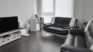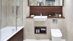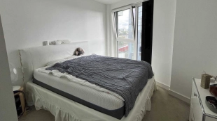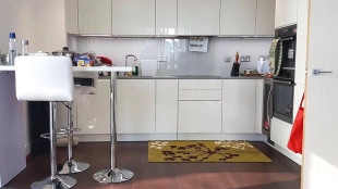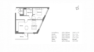 One bedroom apartment on the 4th floor of Nine Elms Point with a modern interior in light colors. Living room with panoramic windows, fitted kitchen, bedroom, marble tiled bathroom and balcony.